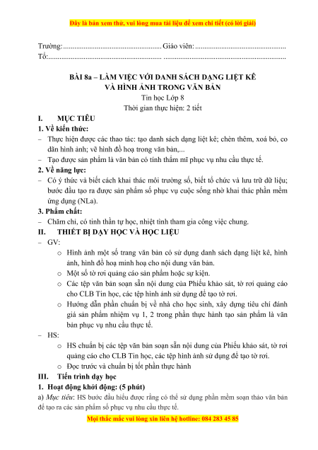 bài học thực hiện thao tác tạo danh sách dạng liệt kê, thao tác thêm hình ảnh, xử