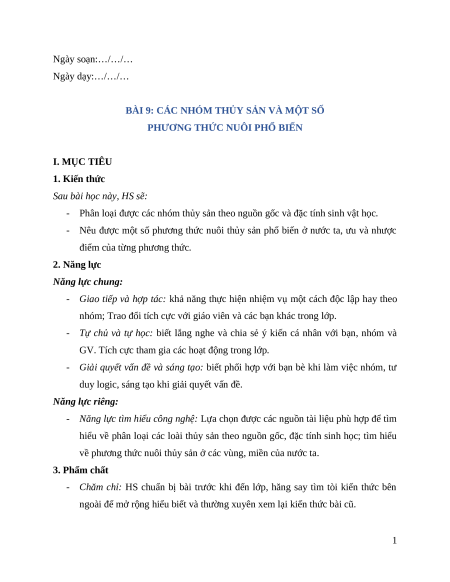 Giáo án Bài 9: Các nhóm thuỷ sản và một số phương thức nuôi phổ biến Công nghệ Lâm nghiệp Thủy sản 12 Kết nối tri thức