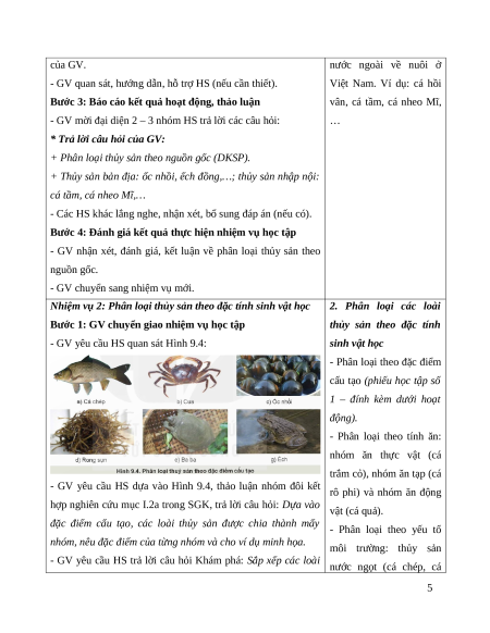 c. Sản phẩm: Câu trả lời của HS về loại các nhóm thủy sản theo nguồn gốc, đặc tính sinh học.