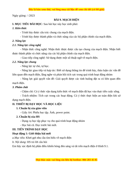 Ngày giảng: / /2023 BÀI 9. MẠCH ĐIỆN