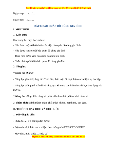 BÀI 9: BẢO QUẢN ĐỒ DÙNG GIA ĐÌNH I. MỤC TIÊU 1. Kiến thức