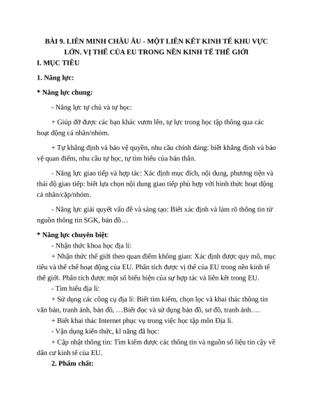 LỚN. VỊ THẾ CỦA EU TRONG NỀN KINH TẾ THẾ GIỚI I. MỤC TIÊU 1. Năng lực: * Năng lực chung:
