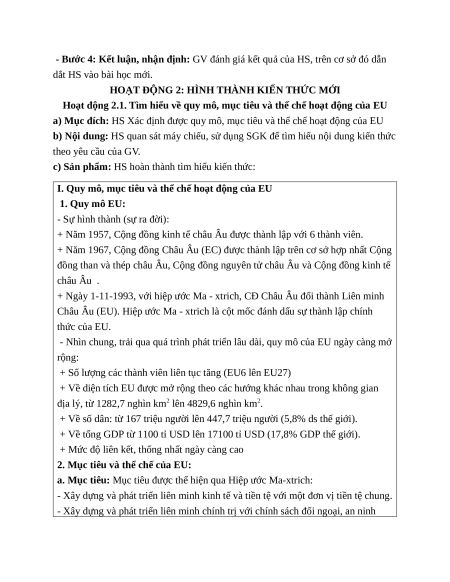 a) Mục đích: HS Xác định được quy mô, mục tiêu và thể chế hoạt động của EU