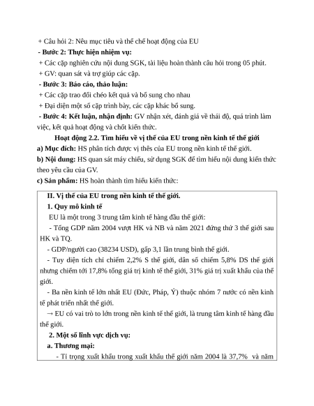 tiêu và thể chế hoạt động của EU. Phân tích được vị thế của EU trong nền kinh tế