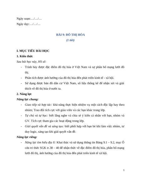Ngày soạn:…/…/… Ngày dạy:…/…/… BÀI 9: ĐÔ THỊ HÓA (1 tiết)
