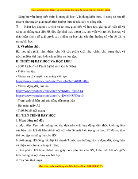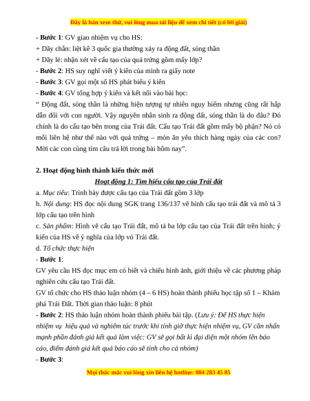Giáo án Bài 9 Địa lí 6 Cánh diều (2024): Cấu tạo của Trái Đất. Các mảnh kiến tạo. Núi lửa và động đất