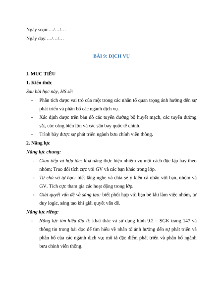Ngày soạn:…/…/… Ngày dạy:…/…/… BÀI 9: DỊCH VỤ I. MỤC TIÊU 1. Kiến thức