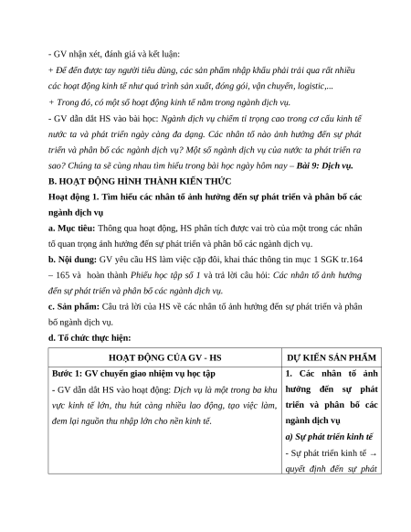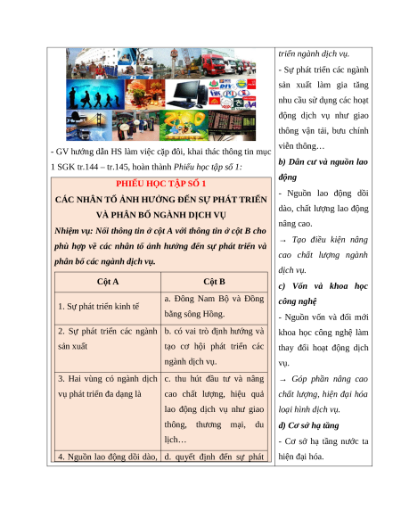 Hoạt động 1. Tìm hiểu các nhân tố ảnh hưởng đến sự phát triển và phân bố các ngành dịch vụ