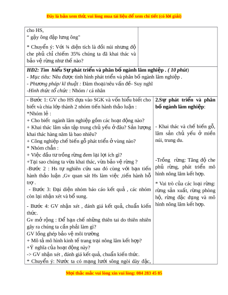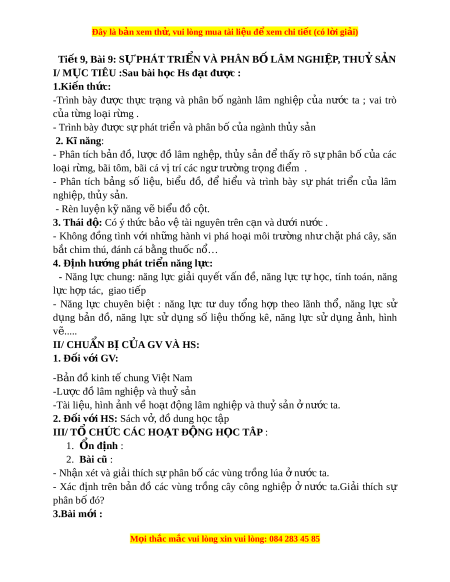 ợ theo lãnh thổ, năng l c ự sử d ng ụ b n ả đồ, năng l c ự sử d ng ụ số li u ệ th ng ố kê, năng l c ự sử d ng ụ nh, ả hình vẽ..... II/ CHUẨN BỊ C A Ủ GV VÀ HS: 1. Đ i ố với GV: -B n ả đồ kinh t chung ế Vi t ệ Nam -Lư c đ ợ ồ lâm nghi p và ệ thuỷ s n ả -Tài li u, hì ệ nh nh ả v ho ề t ạ đ ng l ộ âm nghi p và t ệ hu s ỷ n ả n ở ư c t ớ a. 2. Đ i ố v i ớ HS: Sách v , ở đồ dung h c ọ t p ậ III/ TỔ CH C Ứ CÁC HO T Ạ Đ N Ộ G H C Ọ TÂP : 1. Ổn đ nh ị : 2. Bài cũ : - Nh n xét ậ và gi i