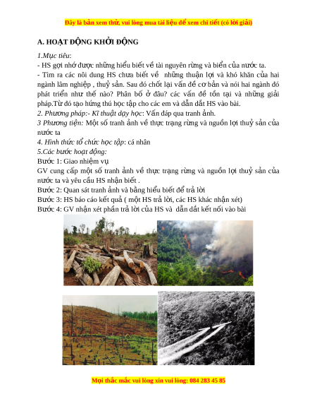 ọ : Vấn đáp qua tranh nh. ả 3 Phư ng ơ ti n ệ : M t ộ số tranh nh ả về th c ự tr ng ạ r ng ừ và ngu n ồ l i ợ thu ỷ s n ả c a ủ nư c ớ ta 4. Hình th c ứ tổ ch c ứ h c t ọ p ậ : cá nhân 5.Các bư c ho ớ t ạ đ ng: ộ Bư c 1: ớ Giao nhi m ệ vụ GV cung c p ấ m t ộ số tranh nh ả về th c ự tr ng ạ r ng ừ và ngu n ồ l i ợ thuỷ s n ả c a ủ nư c ớ ta và yêu c u H ầ S nh n ậ bi t ế . Bư c 2: ớ Quan sát tranh nh và b ả ng ằ hi u bi ể t ế đ t ể r l ả i ờ Bư c 3: ớ HS báo cáo k t ế qu ( ả m t ộ HS tr l ả i ờ , các HS khác nh n xét ậ ) Bư c 4: ớ GV nh n xét ậ phần tr l ả i ờ c a ủ HS và d n d ẫ t ắ k t ế n i ố vào bài M i ọ thắc m c