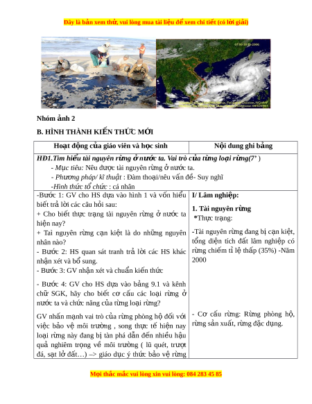 Đây là bản xem th , vu ử i lòng mua tài li u ệ đ xe ể m chi ti t (c ế ó l i ờ gi i ả ) A. HOẠT Đ N Ộ G KH I Ở Đ N Ộ G 1.M c t ụ iêu: - HS g i ợ nh đ ớ ư c ợ nh ng hi ữ u bi ể t ế v t ề ài nguyên r ng và bi ừ n c ể a ủ nư c t ớ a.