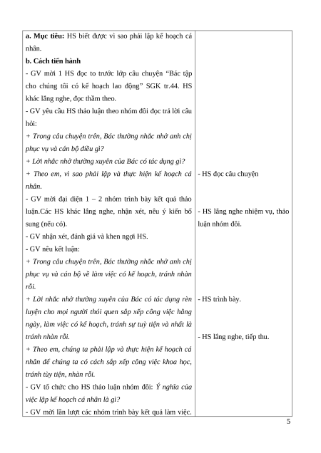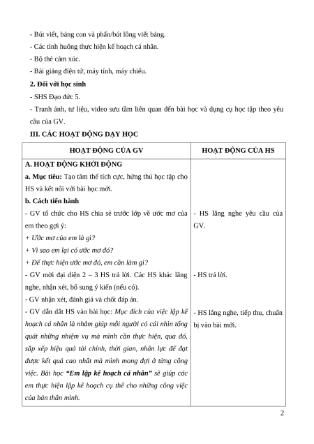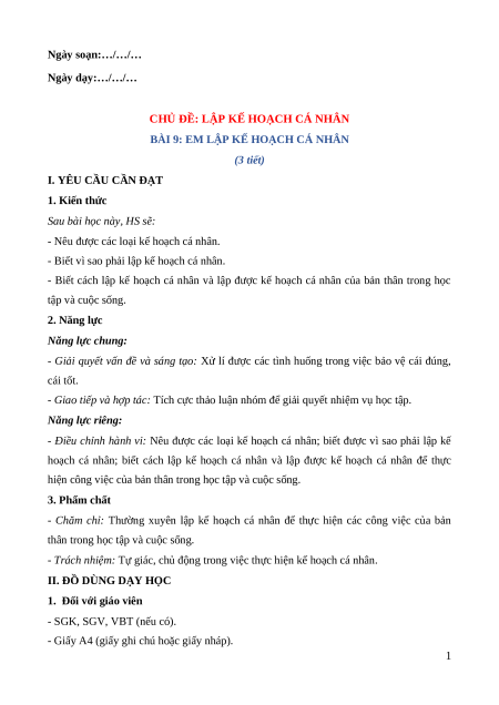 hoạch cá nhân; biết cách lập kế hoạch cá nhân và lập được kế hoạch cá nhân để thực