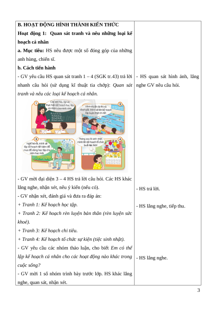 Hoạt động 1: Quan sát tranh và nêu những loại kế hoạch cá nhân
