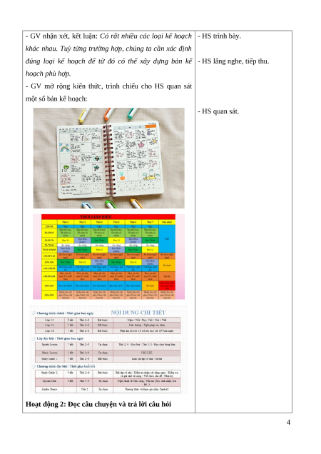 lập kế hoạch cá nhân cho các hoạt động nào khác trong - HS lắng nghe. cuộc sống?