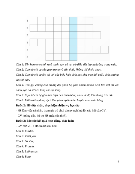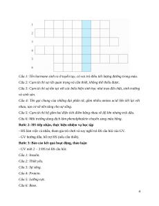 - GV mời 2 – 3 HS trả lời câu hỏi: Câu 1: Insulin. Câu 2: Thiết yếu. Câu 3: Sự sống. Câu 4: Protein. Câu 5: Lưỡng cực. Câu 6: Base. 4