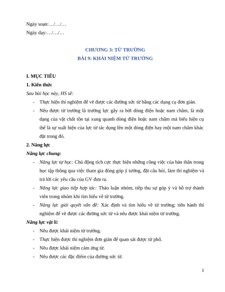 BÀI 9: KHÁI NIỆM TỪ TRƯỜNG I. MỤC TIÊU 1. Kiến thức