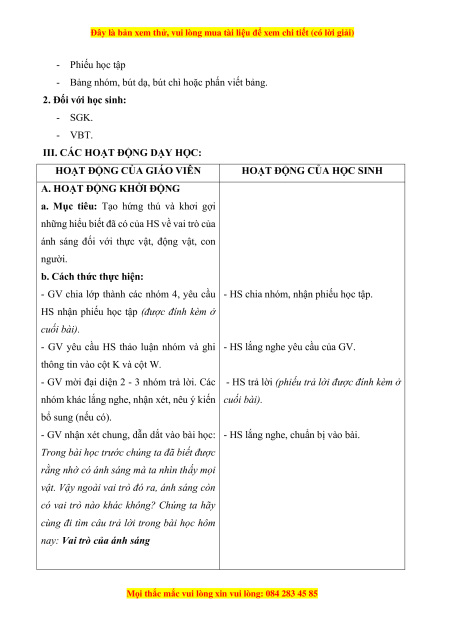 Giáo án Bài 9 Khoa học lớp 4 (Kết nối tri thức): Vai trò của ánh sáng