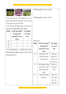 nhóm khác lắng nghe, nhận xét, nêu ý kiến 2a Giúp cây bổ sung (nếu có). Dùng đèn LED chiếu ánh sáng phát triển vào ban đêm tốt hơn, ra hoa trái vụ 2b Sử dụng ánh sáng Giúp cây đèn LED có thể non phát điều chỉnh ánh triển sáng 2c