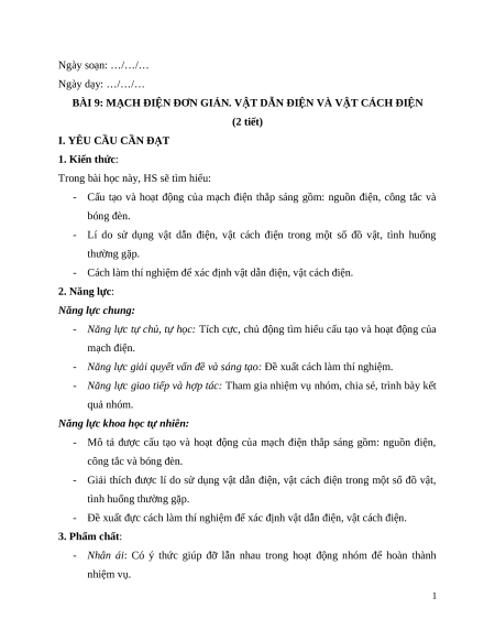 BÀI 9: MẠCH ĐIỆN ĐƠN GIẢN. VẬT DẪN ĐIỆN VÀ VẬT CÁCH ĐIỆN (2 tiết)