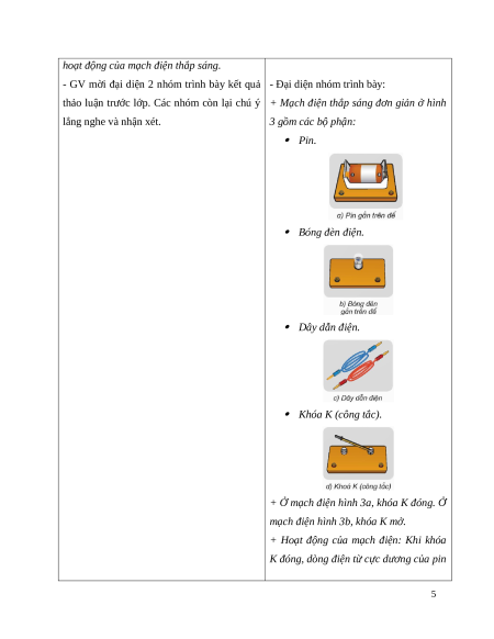 - Mô tả được cấu tạo và hoạt động của mạch điện thắp sáng gồm: nguồn điện, công tắc và bóng đèn.