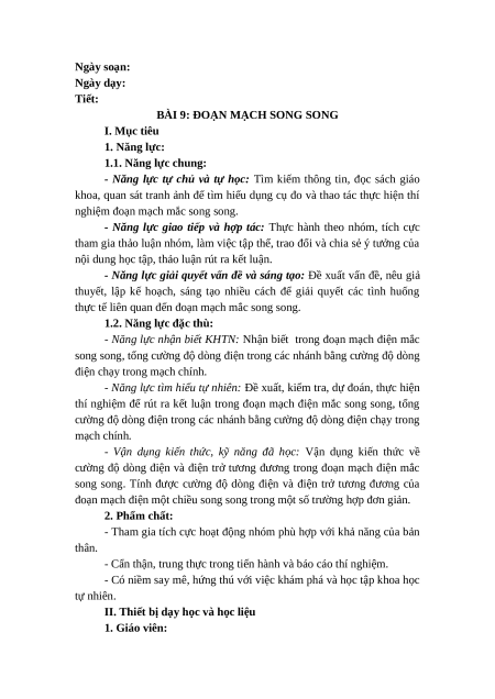 BÀI 9: ĐOẠN MẠCH SONG SONG I. Mục tiêu 1. Năng lực: 1.1. Năng lực chung: