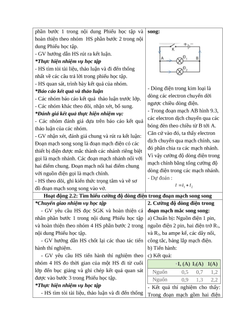 Hoạt động 2.2: Tìm hiểu cường độ dòng điện trong đoạn mạch song song