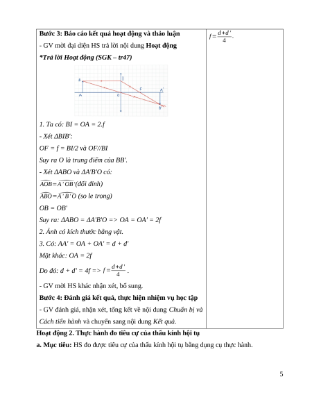 - GV kết luận về cách đo tiêu cự của thấu kính hội tụ.