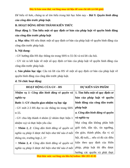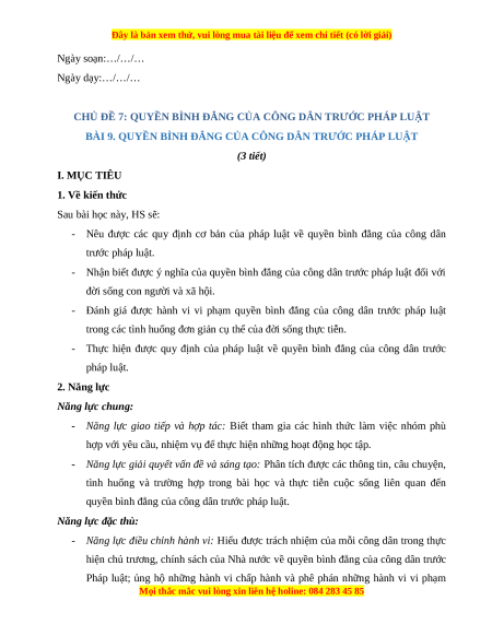 BÀI 9. QUYỀN BÌNH ĐẲNG CỦA CÔNG DÂN TRƯỚC PHÁP LUẬT (3 tiết) I. MỤC TIÊU 1. Về kiến thức Sau bài học này, HS sẽ: