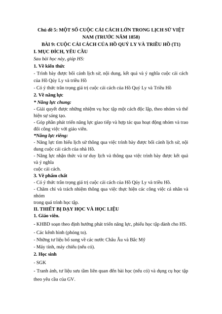BÀI 9: CUỘC CẢI CÁCH CỦA HỒ QUÝ LY VÀ TRIỀU HỒ (T1) I. MỤC ĐÍCH, YÊU CẦU