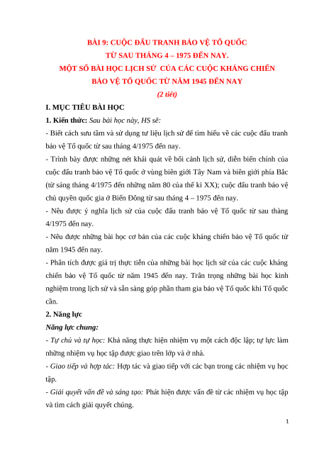 Giáo án Bài 9 Lịch sử 12 Cánh diều (2024): Đấu tranh bảo vệ Tổ quốc từ sau tháng 4 năm 1975 đến nay