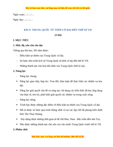 BÀI 9: TRUNG QUỐC TỪ THỜI CỔ ĐẠI ĐẾN THẾ KỈ VII (3 tiết) I. MỤC TIÊU