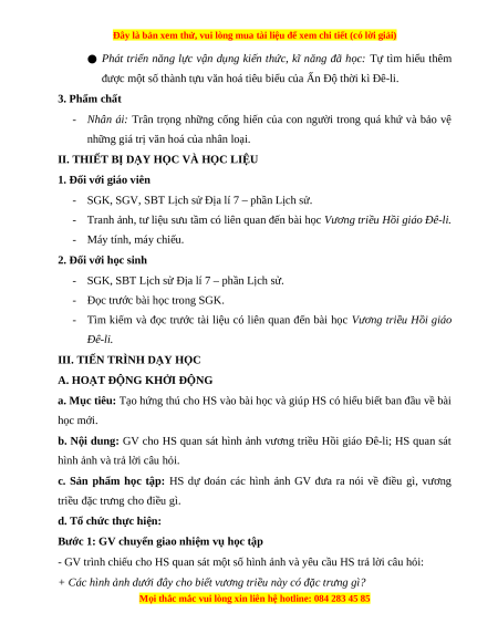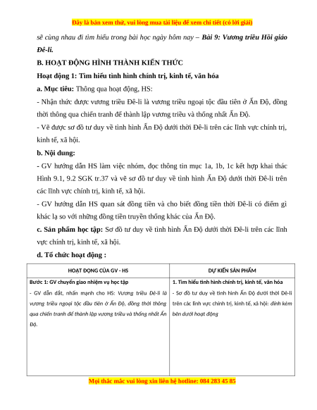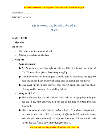 BÀI 9: VƯƠNG TRIỀU HỒI GIÁO ĐÊ-LI (1 tiết) I. MỤC TIÊU 1. Mục tiêu HS học về: