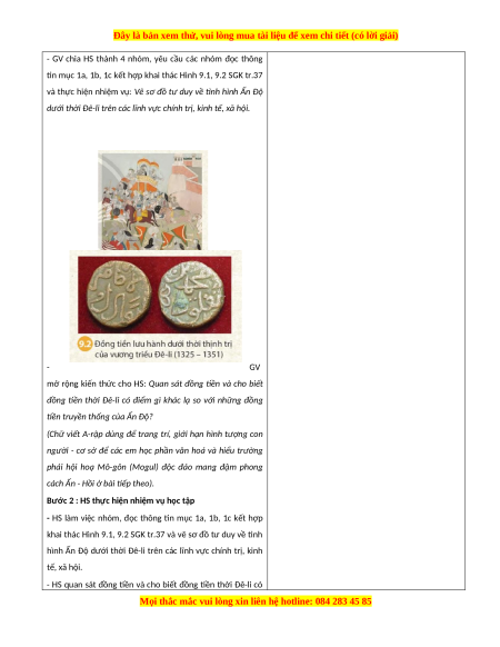 - GV hướng dẫn HS quan sát đồng tiền và cho biết đồng tiền thời Đê-li có điểm gì