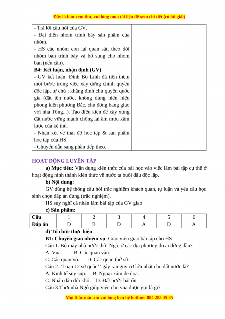 hoạt động hình thành kiến thức về nước ta buổi đầu độc lập.