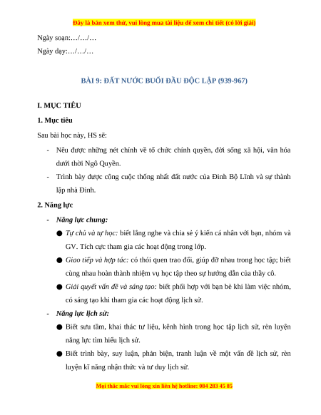 BÀI 9: ĐẤT NƯỚC BUỔI ĐẦU ĐỘC LẬP (939-967) I. MỤC TIÊU 1. Mục tiêu Sau bài học này, HS sẽ: