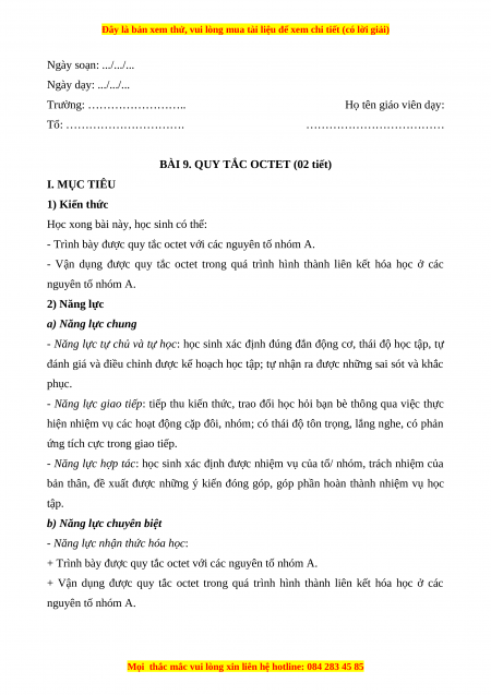BÀI 9. QUY TẮC OCTET (02 tiết) I. MỤC TIÊU 1) Kiến thức