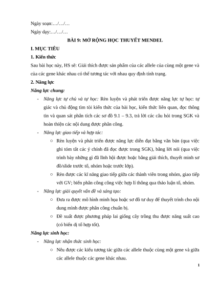 BÀI 9: MỞ RỘNG HỌC THUYẾT MENDEL I. MỤC TIÊU 1. Kiến thức