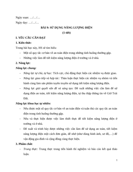 BÀI 9: SỬ DỤNG NĂNG LƯỢNG ĐIỆN (1 tiết)