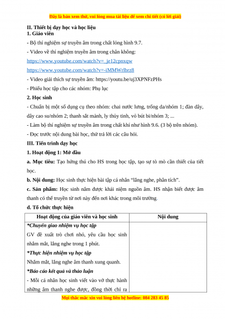 b. Nội dung: học sinh làm thí nghiệm về sự truyền sóng âm.