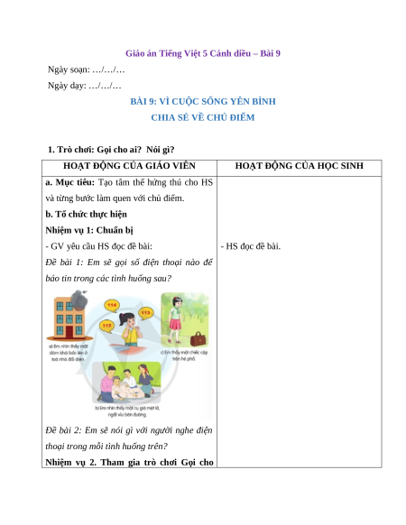 Giáo án Tiếng Việt 5 Cánh diều – Bài 9 Ngày soạn: …/…/… Ngày dạy: …/…/…