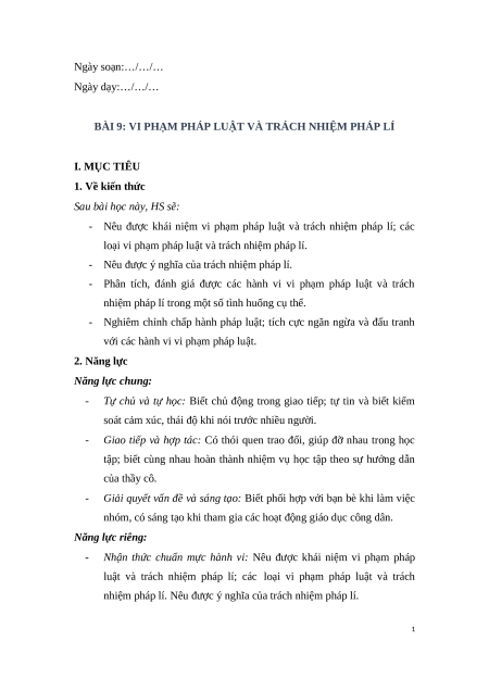 BÀI 9: VI PHẠM PHÁP LUẬT VÀ TRÁCH NHIỆM PHÁP LÍ I. MỤC TIÊU 1. Về kiến thức