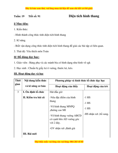 Tuần: 19 Tiết số: 91 Diện tích hình thang