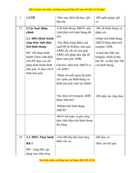 ;tính diện tích hình thang đã nhận xét. cho. 2.1. HĐ1:Hình thành +Diện tích hình thang