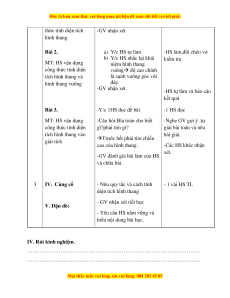 thức tính diện tích -GV nhận xét hình thang. Bài 2. a) Y/c HS tự làm -HS làm,đổi chéo vở b) Y/c HS nhắc lại khái kiểm tra MT: HS vận dụng niệm hình thang công thức tính diện vuông→ độ cao chính tích hình thang và là cạnh vuông góc với hình thang vuông đáy. -GV nhận xét. -HS tự làm và báo cáo kết quả Bài 3. -Y/c 1HS đọc đề bài -1 HS đọc MT: HS vận dụng