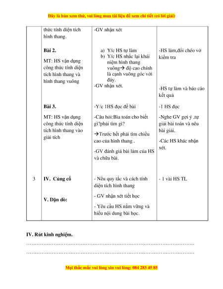 - Nêu quy tắc và cách tính - 1 vài HS TL diện tích hình thang - GV nhận xét tiết học V. Dặn dò: