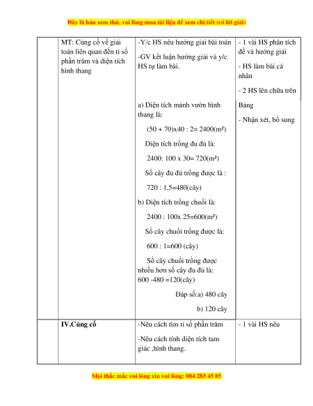 -Củng cố về giải toán liên quan đến diện tích và tỷ số phần trăm.