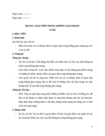 BÀI D1: GIAO TIẾP TRONG KHÔNG GIAN MẠNG (2 tiết) I. MỤC TIÊU 1. Kiến thức