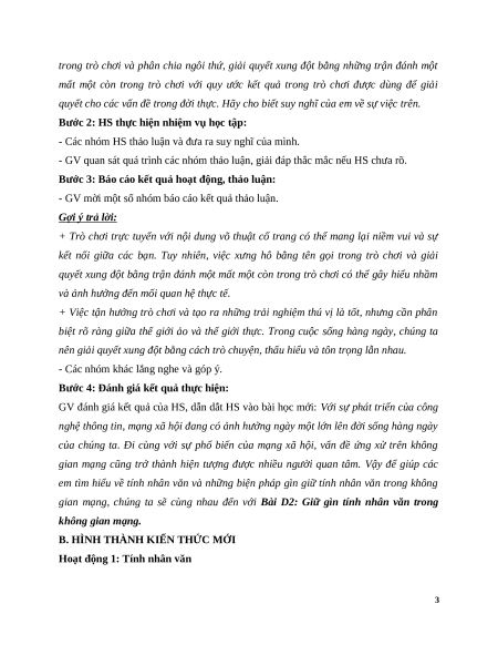 BÀI D2: GÌN GIỮ TÍNH NHÂN VĂN TRONG KHÔNG GIAN MẠNG (1 tiết) I. MỤC TIÊU 1. Kiến thức