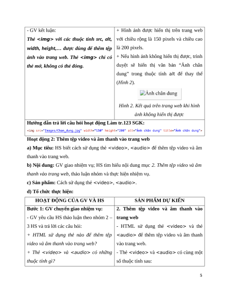 tìm hiểu, trả lời câu hỏi hoạt động Làm Ví dụ 1: Mã lệnh HTML sau hiển thị tệp tr.123 SGK: