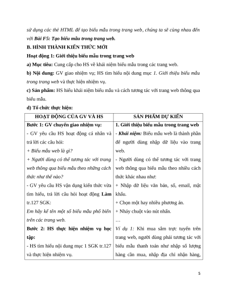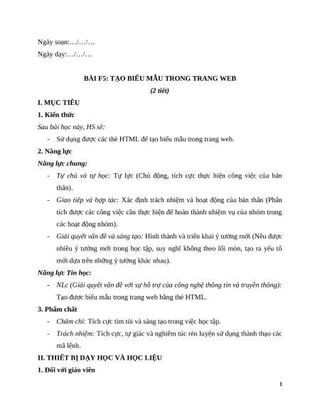 BÀI F5: TẠO BIỂU MẪU TRONG TRANG WEB (2 tiết) I. MỤC TIÊU 1. Kiến thức